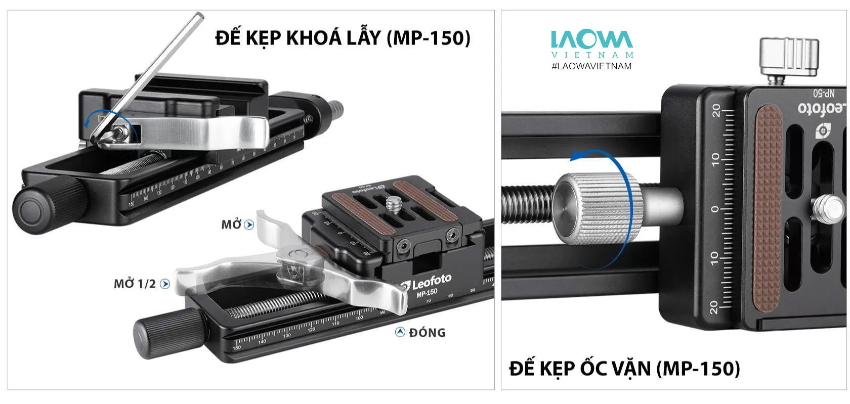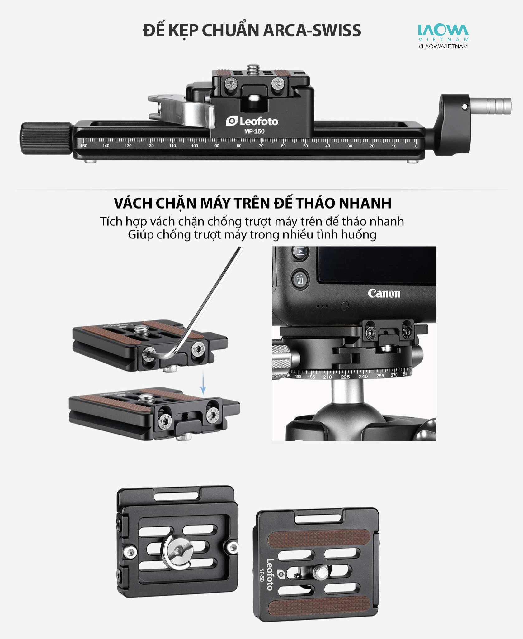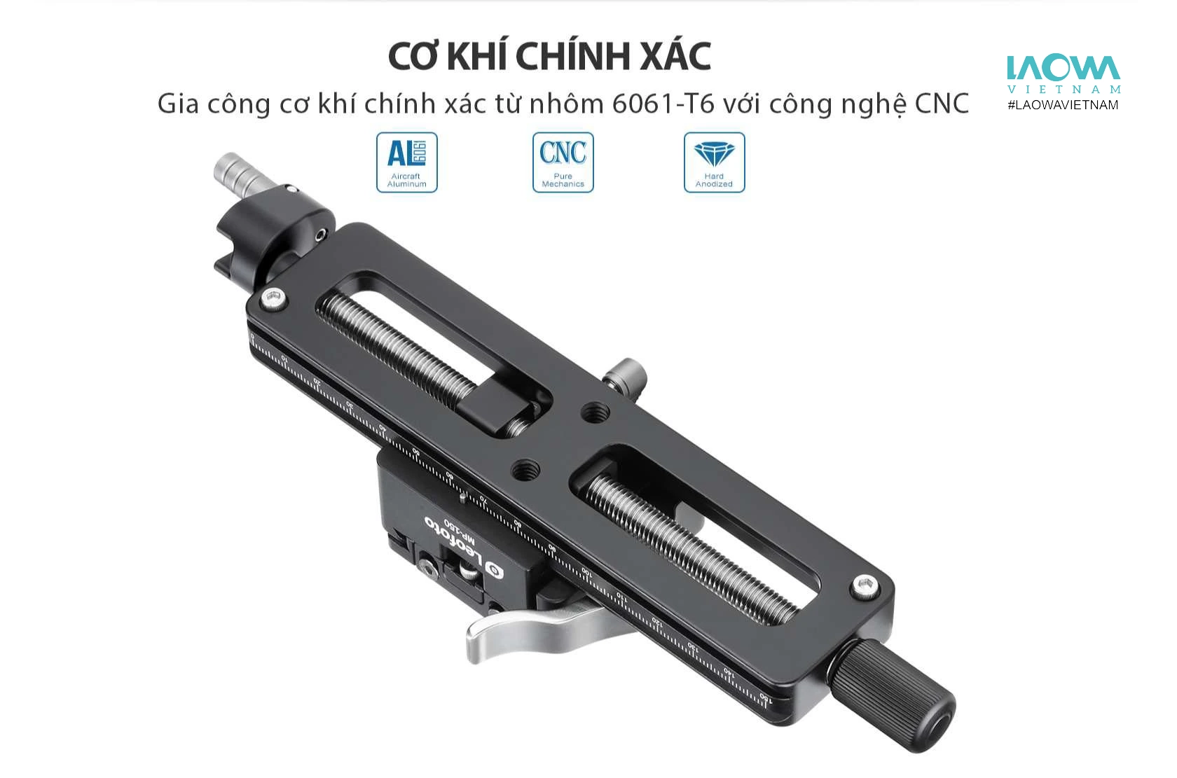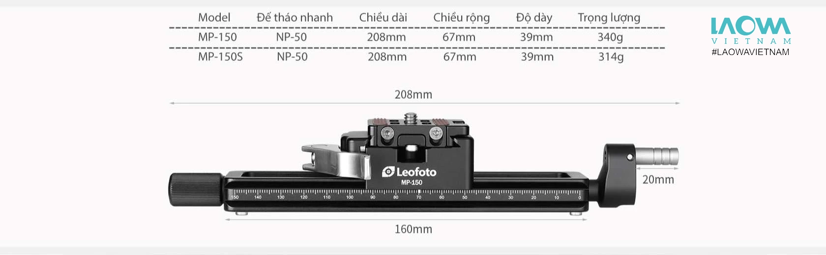 - Chất liệu cao cấp, thiết kế bền bỉ: MP-150S được làm từ nhôm chắc chắn với lớp phủ anod hóa, đảm bảo độ bền và tuổi thọ cao. Thanh trượt tương thích với hệ thống Arca Swiss và có thêm cổng kết nối ren 1/4″.